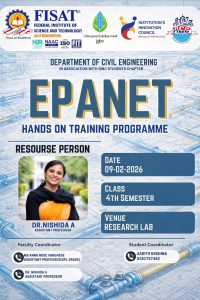 The department organized a hands-on training session on “EPANET” for the fourth-semester B. Tech Civil Engineering students on 09 February 2026, in association with IGBC Students Chapter. The training was handled by Dr. Nishida A, Assistant Professor, FISAT.