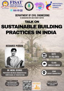 An invited talk on “Sustainable Building Practices in India” was held on 24th February 2026 in association with the IGBC Student Chapter, featuring Dr. Meril George, Professor and Dean (Administration), SCMS School of Architecture, at the Library Seminar Hall for final year B.Tech students.