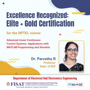 3.Dr. Parvathy R secured Elite + Gold Certification for NPTEL course on Advanced Linear Continuous control systems : Applications with MATLAB Programming and simulink