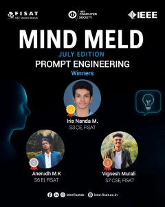 Iris Nanda M of S3 CE B bagged the first prize in the Mind Meld: Prompt Engineering Quiz during the July Mind Meld Session, organised by IEEE FISAT Student Branch with IEEE CS SBC FISAT.