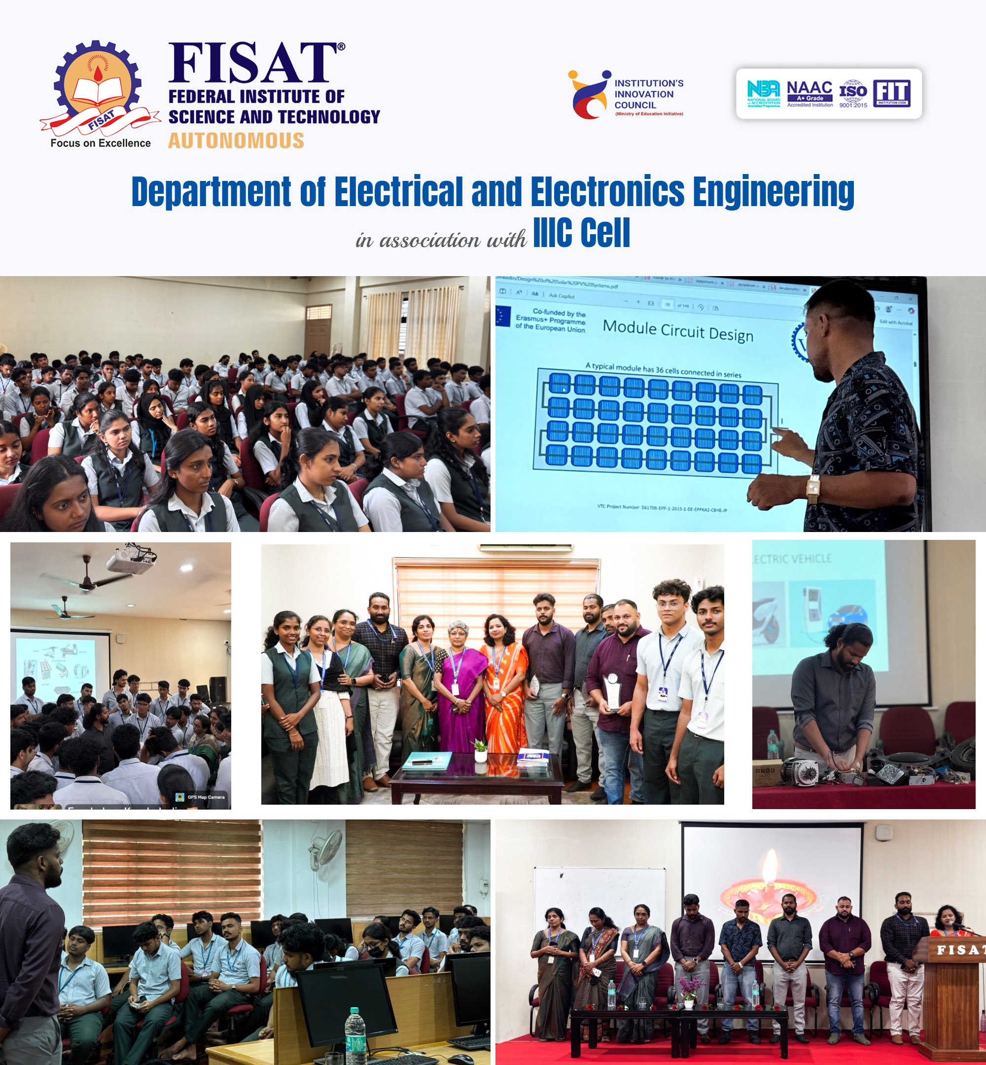 The Department of Electrical and Electronics Engineering at FISAT, in association with the IIIC Cell and with the support of MTTC, successfully organized a one-day workshop on the topic “Smart Energy Technologies: EV, Solar & PLC Automation.” The workshop was inaugurated by the Head of the Department, Dr. Surya Susan Alex. Dr. Archana R, Member Secretary, Dr. Hareesh T.M, IIIC Coordinator, and workshop coordinators from the EEE Department, Mrs. Deepa K and Dr. Rinku Skaria, also addressed the gathering. The workshop served as an excellent opportunity for both students and faculty to enhance their technical knowledge and practical skills in the field.
