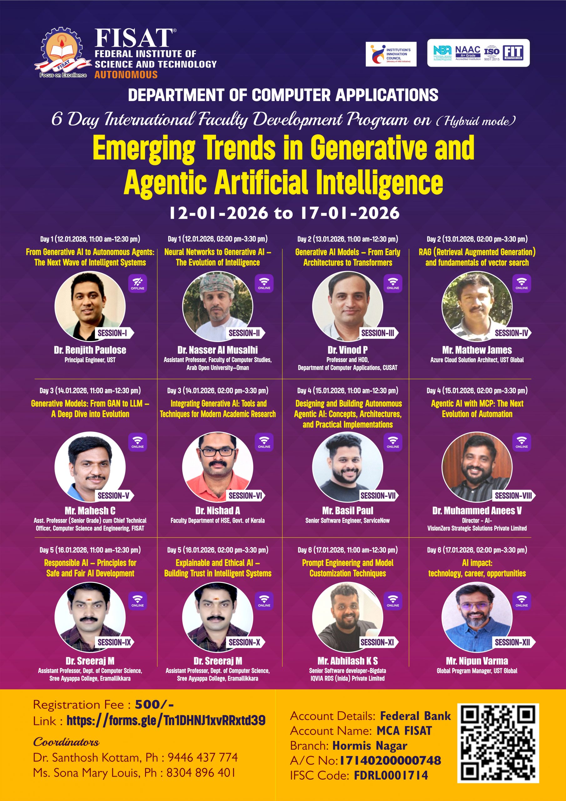 The Department of Computer Applications, FISAT is organizing a 6-Day International Faculty Development Programme (Hybrid Mode) on Emerging Trends in Generative and Agentic Artificial Intelligence scheduled from 12 January 2026 to 17 January 2026. The programme brings together international and industry experts to share insights on the latest developments in Generative AI, Agentic AI, LLMs, RAG, Responsible AI, Explainable AI, and Prompt Engineering.