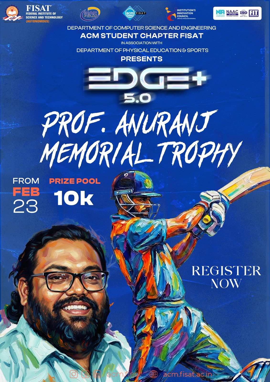 ACM Student Chapter FISAT of Computer Science & Engineering Department in association with Department of Physical Education and Sports proudly presents the inter-department cricket tournament as part of EDGE+5.0πŸ’« ╔═══════‒◕‒‒◕‒════════╗ πŸ†PROF. ANURANJ MEMORIAL TROPHY'26πŸ† β•šβ•β•β•β•β•β•β•β€’β—•β€’β€’β—•β€’β•β•β•β•β•β•β•β•β• Let's celebrate passion, competitive spirit, and unforgettable moments on the field.