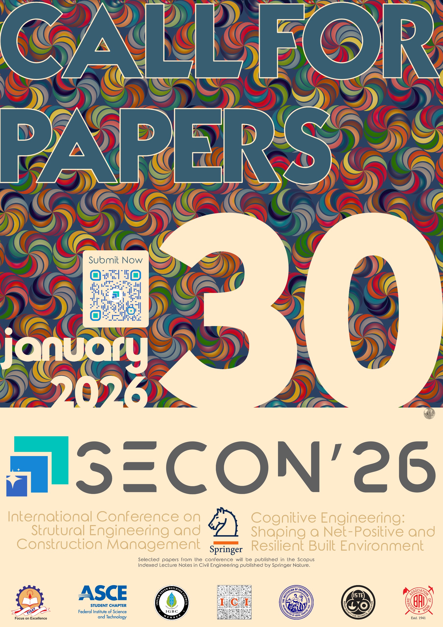 The Department of Civil Engineering, Federal Institute of Science and Technology (FISAT), Angamaly, Ernakulam, Kerala proudly announces the Seventh edition of the International Conference on Structural Engineering and Construction Management (SECON'26) from 3rd to 5th of June 2026 to be held in hybrid mode.